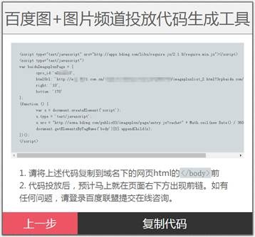 本业务通过上传一个html文件到网站,自动生成一个“图片墙”样式的图片频道,然后通过网盟提供的标准前链代码或自定义前链进行投放(频道内所有图片的更新、推荐、版权等都由百度提供,频道内的图片为百度&百度联盟联合第三方版权图片平台提供)。